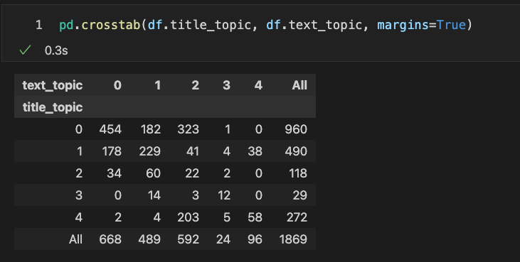 text_tokens.text_tokens and store in column text_ngrams.text_model, using text_ngrams using num_topics=5.text_model and store in column text_topics.Then a crosstab of df.title_topics and df.text_topics should have a single large count in each row and in each column.